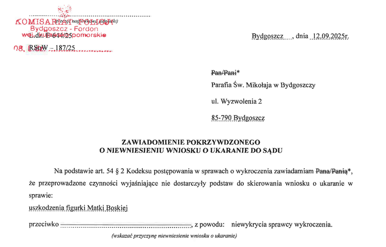 Pod koniec września, parafia otrzymała zawiadomienie z komisariatu policji, że nie wniesiono wniosku o ukaranie sprawców zniszczenia figury Matki Boskiej przy naszym kościele z powodu niewykrycia sprawcy. Warto nadmienić, że informowaliśmy policję o zgłoszeniu się świadka, który widział całe zajście, jednakże reakcja funkcjonariusza sprawiała wrażenie znikomego zainteresowania sprawą; sugerowano nawet, że uszkodzenie zaistniało „samo”.
