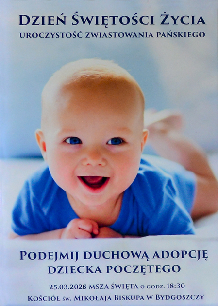 Kościół katolicki 25 marca obchodzi uroczystość Zwiastowania Pańskiego, czyli przyjście archanioła Gabriela do Maryi i ogłoszenie jej, że za sprawą Ducha Świętego pocznie Syna Bożego. W Kościele wschodnim uroczystość wprowadzono w V w., a na Zachodzie w VI w. W odpowiedzi na wezwanie papieża Jana Pawła II Episkopat Polski w 1998 r. uroczystość Zwiastowania Pańskiego ustanowił Dniem Świętości Życia. Tego właśnie dnia można podjąć Duchową Adopcję Dziecka Poczętego.