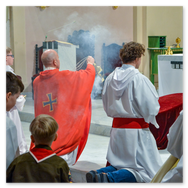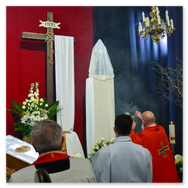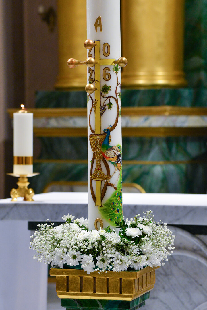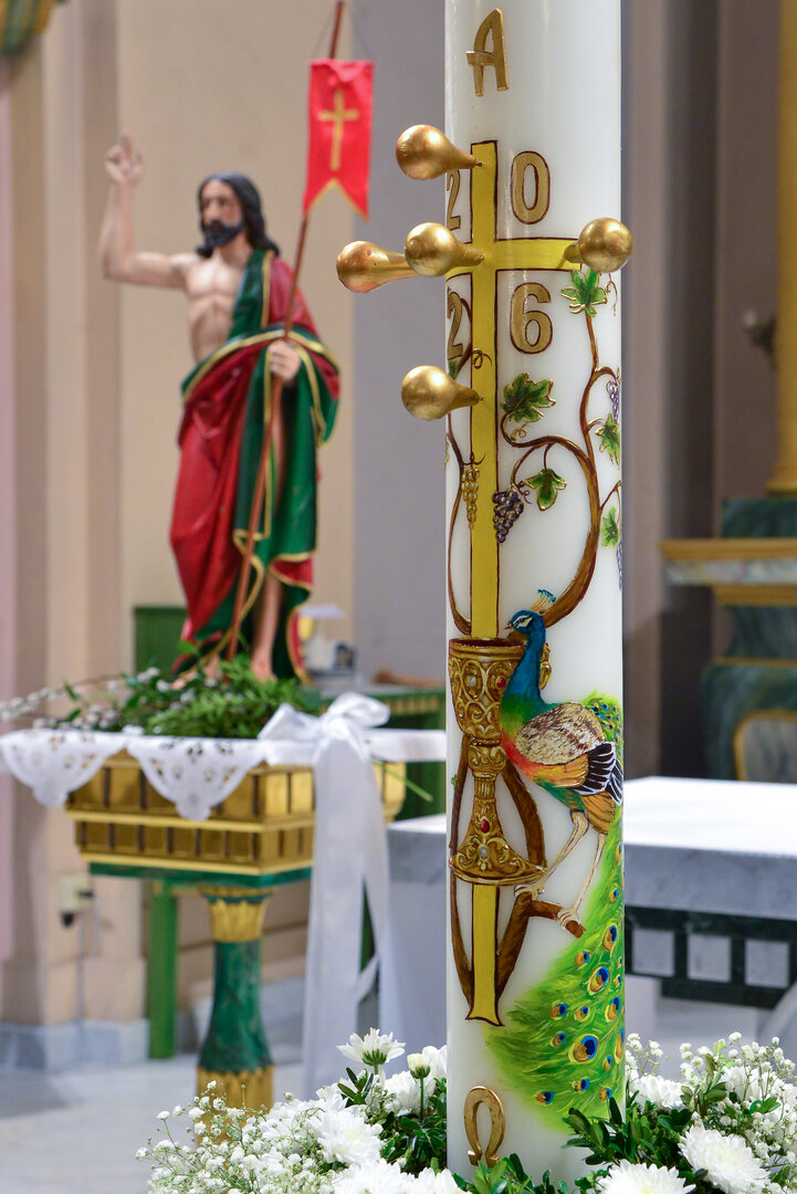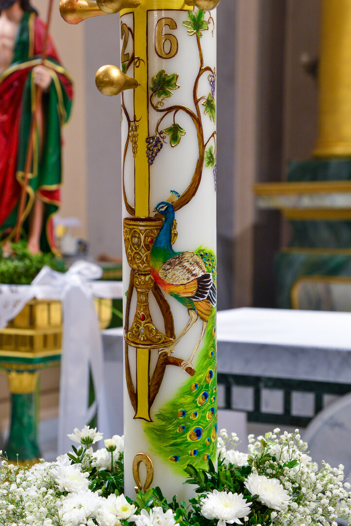 Kapłan żłobi na paschale rylcem krzyż, a nad nim grecką literę alfa, pod krzyżem literę omega, a na czterech polach między ramionami krzyża cyfry bieżącego roku. Jednocześnie głośno i wyraźnie mówi: „Chrystus wczoraj i dziś. Początek i koniec. Alfa i Omega. Do Niego należy czas i wieczność. Jemu chwała i panowanie”.